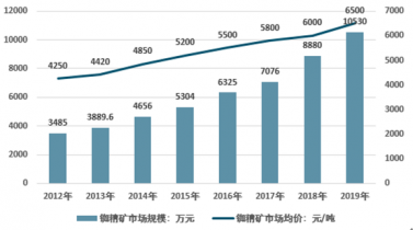 2012-2019年我國銣精礦市場規(guī)模及均價走勢圖