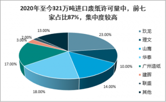 2020年至今321萬(wàn)噸進(jìn)口廢紙?jiān)S可量中,前七家占比87%,集中度較高