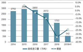 2014-2019年H1中國進口廢紙量及增速趨勢