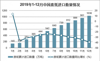 2019年1-12月中國廢紙進口數(shù)量為1036萬噸,同比下降39.1%;