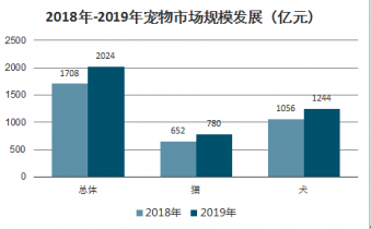 2019年中國寵物(犬貓)消費市場突破2000億的關卡,整體消費規(guī)模達到2024億元,比2018年增長18.5%;寵物犬消費市場規(guī)模為1244億元,比2018年增長17.8%;寵物貓消費市場規(guī)模為780億元,增幅達19.6%,超過犬消費市場規(guī)模增速。