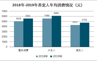 2019年單只寵物年消費金額同比2018年增長545元,增幅10.9%;寵物犬類人均單只消費與2018年同比增長9.0%;人均單只寵物貓年消費金額與2018年同比增長10.3%;2019年總體的月均消費則在463.4元。
