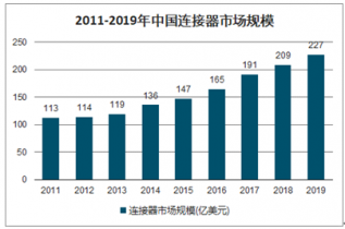 近年來(lái),中國(guó)經(jīng)濟(jì)保持持續(xù)快速增長(zhǎng),在中國(guó)經(jīng)濟(jì)高速發(fā)展的帶動(dòng)下,通信、交通、電腦、消費(fèi)電子等連接器下游市場(chǎng)也取得了快速增長(zhǎng),直接帶動(dòng)我國(guó)連接器市場(chǎng)需求急劇增長(zhǎng),2011年到2019年,中國(guó)連接器市場(chǎng)規(guī)模由113億美元增長(zhǎng)到227億美元。
