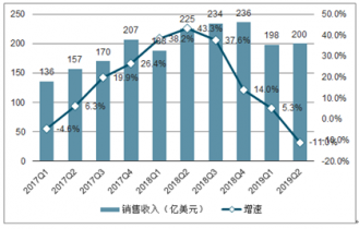 2017-2019年全球服務器市場季度銷售收入及增速趨勢