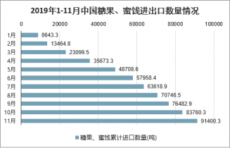 2019年1-11月糖果、蜜餞進(jìn)口數(shù)量為91400.3噸,同比增長(zhǎng)49.8%;出口數(shù)量為376592.5噸,同比增長(zhǎng)2.8%。2019年1-11月糖果、蜜餞進(jìn)口金額為30080萬美元,同比增長(zhǎng)26.7%;出口金額為115480萬美元,同比增長(zhǎng)6%。