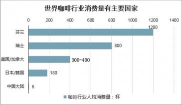 芬蘭平均每人每年1200余杯,瑞士800杯,美國、加拿大則是300-400杯左右。在亞洲國家,日本和韓國是人均180杯。而中國北上廣地區(qū)人均15杯,全國每年人均咖啡飲用量僅為6杯。
