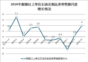 2019年限額以上單位石油及制品類零售額實(shí)現(xiàn)20042億元,累計(jì)增長1.2%,增速較1-11月份加快0.2個(gè)百分點(diǎn),較上年大幅放緩12.1個(gè)百分點(diǎn)。其中,12月份石油及制品零售額同比增長4%,增速較11月份加快3.5個(gè)百分點(diǎn)。