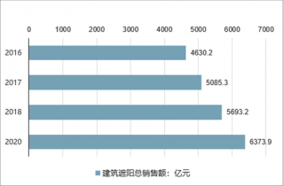 隨著國民經(jīng)濟(jì)的迅猛發(fā)展,人們生活水平的快速提高,建筑遮陽行業(yè)的需求日益旺盛。根據(jù)建筑遮陽行業(yè)協(xié)會(huì)統(tǒng)計(jì),2016年建筑遮陽行業(yè)總銷售額約4630.2億元,2017年總銷售額約達(dá)到5085.3億元;2018年也迎來穩(wěn)步增長(zhǎng),總銷售額約達(dá)5693.2億元,。預(yù)計(jì)至2020年,行業(yè)總銷售額約6373億元,出口額約200億元。