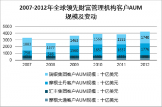 2007-2012年全球領先財富管理機構客戶AUM規(guī)模及變動