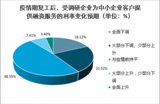48.55%的企業(yè)表示,其為中小企業(yè)客戶提供融資服務(wù)的利率將會與疫情前持平;而22.52%的企業(yè)表示將大部分下調(diào)、少部分上升;18.12%的企業(yè)表示將全面下調(diào)。