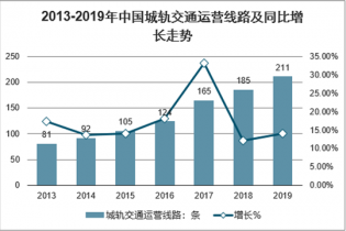 2013-2019年中國城軌交通運營線路及同比增長走勢