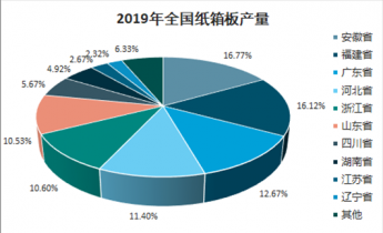2019年全國紙箱板完成累計產(chǎn)量1301.56萬噸,同比增長6.62%。產(chǎn)量排在前五位的地區(qū)依次是安徽省、福建省、廣東省、河北省和浙江省。
