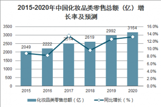 2015-2020年中國化妝品類零售總額(億)增長率及預測
