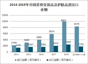 2014-2019年中國美容化妝品及護膚品進出口金額
