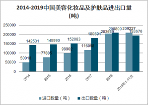 2019年中國美容化妝品及護膚品進口量為209227噸,同比增長11.5%。