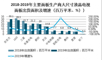 2018-2019年主要面板生產(chǎn)商大尺寸液晶電視面板出貨面積及增速(百萬平米、%))