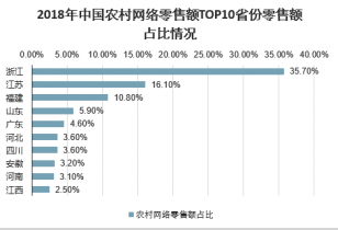 2018年中國(guó)農(nóng)村網(wǎng)絡(luò)零售額TOP10省份零售額占比情況