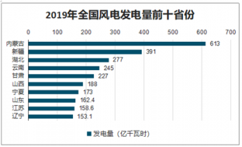 在風(fēng)電發(fā)電方面,2019年全國發(fā)電量排在前十的省份分別是內(nèi)蒙古(612.8億千瓦時)、新疆(391.4億千瓦時)、河北(277.3億千瓦時)、云南(245.3億千瓦時)、甘肅(226.9億千瓦時)、山西(188.1億千瓦時)、寧夏(173億千瓦時)、山東(162.4億千瓦時)、江蘇(158.6億千瓦時),遼寧(153.1億千瓦時)。