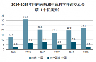 2014-2019年國內(nèi)醫(yī)藥和生命科學并購交易金額(十億美元)