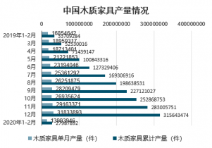 2020年2月中國木質(zhì)家具產(chǎn)量為13993946件,同比下降32.5%;2020年1-2月中國木質(zhì)家具產(chǎn)量為27987892件,同比下降32.5%。