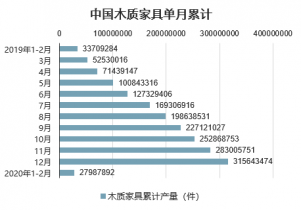 2020年2月中國木質(zhì)家具產(chǎn)量為13993946件,同比下降32.5%;2020年1-2月中國木質(zhì)家具產(chǎn)量為27987892件,同比下降32.5%。