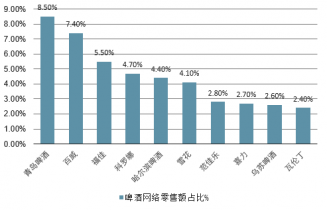 2019年3月啤酒網(wǎng)絡(luò)零售TOP10品牌分別是:青島啤酒、百威、福佳、科羅娜、哈爾濱啤酒、雪花、范佳樂、喜力、烏蘇啤酒、瓦倫丁。其中,青島啤酒市場(chǎng)占比第一,占比達(dá)到啤酒行業(yè)總體網(wǎng)絡(luò)零售額的8.5%。其次,百威啤酒則位居第二,占比為7.4%。