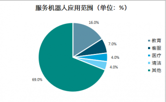 服務(wù)機器人是龐大機器人家族中的一個年輕成員,到目前為止尚沒有一個嚴格的定義。根據(jù)其用途不同,可以劃分為保潔機器人、教育機器人、醫(yī)療機器人、家用機器人、服務(wù)型機器人及娛樂機器人,應(yīng)用范圍非常廣泛。目前,教育機器人市場份額約為16%,客服機器人份額約7%,醫(yī)療、清潔用服務(wù)機器人占比均在4%左右。