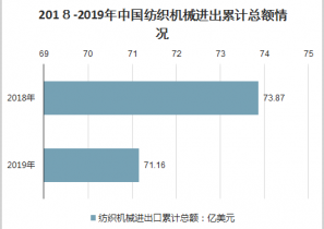 2019年我國紡織機械進出口累計總額為71.16億美元。其中:紡織機械出口37.83億美元,同比增長2.96%;進口33.33億美元,同比下降10.49%。