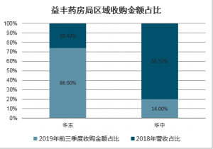2019年收購業(yè)務(wù)集中在華東、華中市場,占比分別為86%、14%;華東、華中市場亦為益豐藥房現(xiàn)有業(yè)務(wù)中最大兩個區(qū)域市場,2018年營收占比分別為30.42%、56.57%。