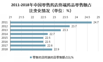 2011-2018年中國零售藥店終端藥品零售額占比變化情況(單位:%)