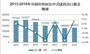 2013-2019年中國(guó)中藥材及中式成藥出口量及增速