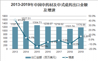 2013-2019年中國(guó)中藥材及中式成藥出口金額及增速