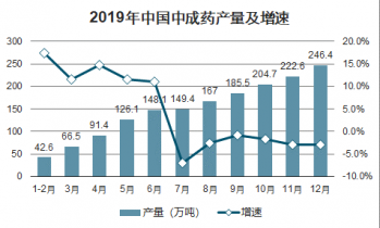2018年全年中國中成藥產(chǎn)量達(dá)到了261.9萬噸,累計下降7.7%。2019年1-4季度中國中成藥產(chǎn)量波動幅度不大,截止至2019年12月中國中成藥產(chǎn)量為23.8萬噸,同比下降9.8%。累計方面,2019年1-12月中國中成藥產(chǎn)量達(dá)到246.4萬噸,累計下降2.9%。
