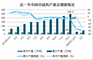 2020年3月中國中成藥產(chǎn)量為18.6萬噸,同比下降30.9%;2020年1-3月中國中成藥產(chǎn)量為46.2萬噸,同比下降39.8%。