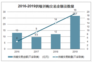 2016年至2019年供暖市場的交易數(shù)量上持續(xù)增長,年化增長率達(dá)68%。交易金額上2016年至2018年處于下降的趨勢,而2019年交易額逆勢上升,較2018年增長123%,單筆交易金額也略有所上升。2019年供暖行業(yè)共發(fā)生并購19筆,交易金額為26.7億元。