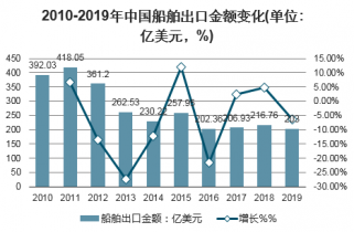 2010-2019年,受國際船舶市場低迷影響,我國船舶出口金額總體呈下降趨勢,2011年出口金額為近年來最大值418.05億美元。2019年,我國船舶出口金額為203億美元,同比下降6.35%,出口金額不足2011年的一半。