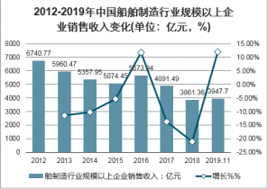 2012-2019年中國船舶制造行業(yè)規(guī)模以上企業(yè)銷售收入變化(單位:億元,%)
