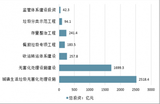 “十三五”期間全國城鎮(zhèn)生活垃圾無害化處理設施建設總投資約2518.4億元。其中,無害化處理設施建設投資1699.3億元,收運轉運體系建設投資257.8億元,餐廚垃圾專項工程投資183.5億元,存量整治工程投資241.4億元,垃圾分類示范工程投資94.1億元,監(jiān)管體系建設投資42.3億元。