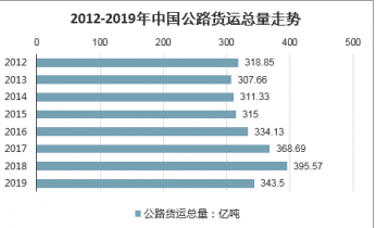 2012-2018年,中國公路貨運(yùn)量呈現(xiàn)波動(dòng)增長。2018年,全國貨運(yùn)車輛完成貨運(yùn)量達(dá)到新高峰,為395.97億噸,比2017年增長7.29%。2019年,全國公路貨運(yùn)量總計(jì)為343.5億噸,增長4.2%,完成貨物周轉(zhuǎn)量59636.39億噸公里,增長0.4%。