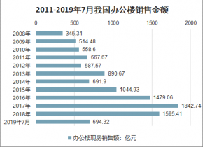 2018年我國辦公樓銷售總額為6276.83億元,銷售額同比下降2.55%。2019年1-7月我國辦公樓銷售總額為2834.72億元,同比下降13.26%。其中,現(xiàn)房銷售額694.32億元,同比下降18.02%;期房銷售額為2140.40億元,同比下降11.59%。