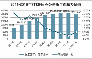 國家統(tǒng)計局數(shù)據(jù)顯示,2017年我國辦公樓施工面積為36014.62萬平方米,2018年為35842.23萬平方米,同比下降0.48%。而2019年1-7月辦公樓施工面積為34416.34萬平方米,同比增長4.29%。