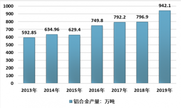 2013-2019年中國鋁合金產(chǎn)量走勢