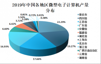 2019年重慶市、四川省、江蘇省和廣東省微型計算機設(shè)備產(chǎn)量排名前四,占中國微型計算機設(shè)備產(chǎn)量比重為76.18%。重慶市、四川省、江蘇省和廣東省產(chǎn)量分別為7614.3萬臺、6584.2萬臺、6032.3萬臺和5784.7萬臺,分別占比為22.29%、19.27%、17.66%和16.93%。其次為安徽省和福建省,產(chǎn)量為2253.8萬臺和2192.4萬臺,占比為6.6%和6.42%。