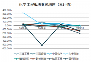 2019年化學工程板塊營收業(yè)績運行平穩(wěn),收入增速排名前三的為鎮(zhèn)海股份、三聯(lián)虹普、中國化學;業(yè)績增速排名前三的別為三維工程、三聯(lián)虹普、中國化學。其中龍頭公司中國化學營收增長較快主要因前期訂單大幅增長;業(yè)績增長58%,主要因收入增長較快,同時各項費用率及有效所得稅率降低所致。2020Q1在油價暴跌和新冠疫情背景下化學工程板塊大多企業(yè)營收與業(yè)績增速均出現(xiàn)回落。