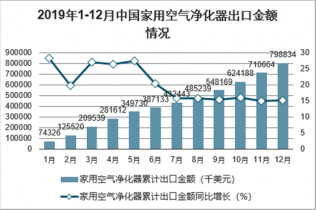 2019年1-12月中國(guó)家用空氣凈化器出口金額為798834千美元,同比增長(zhǎng)15.1%。