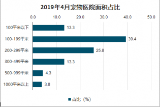 我國的寵物醫(yī)院多以300平米以下的中小型醫(yī)院為主,其中100-199平米的占比最高,近40%,其次是200-299平米,占比25.8%。