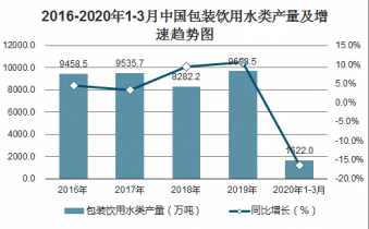 2016-2020年1-3中國包裝飲用水類產(chǎn)量及增速趨勢圖