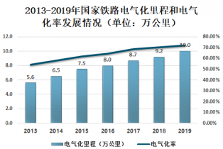 2013-2019年國家鐵路電氣化里程和電氣化率發(fā)展情況(單位:萬公里)