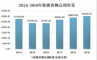 2019年全國鐵路貨運總周轉(zhuǎn)量完成 30181.95 億噸公里,比上年增加 1360.96 億噸公里,增長 4.72%。