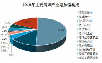 2019年,我國主要海洋產(chǎn)業(yè)保持穩(wěn)步增長,全年實現(xiàn)增加值35724億元,比上年增長7.5%。濱海旅游業(yè)、海洋交通運輸業(yè)和海洋漁業(yè)作為海洋經(jīng)濟發(fā)展的支柱產(chǎn)業(yè),其增加值占主要海洋產(chǎn)業(yè)增加值的比重分別為50.6%、18.0%和13.2%。